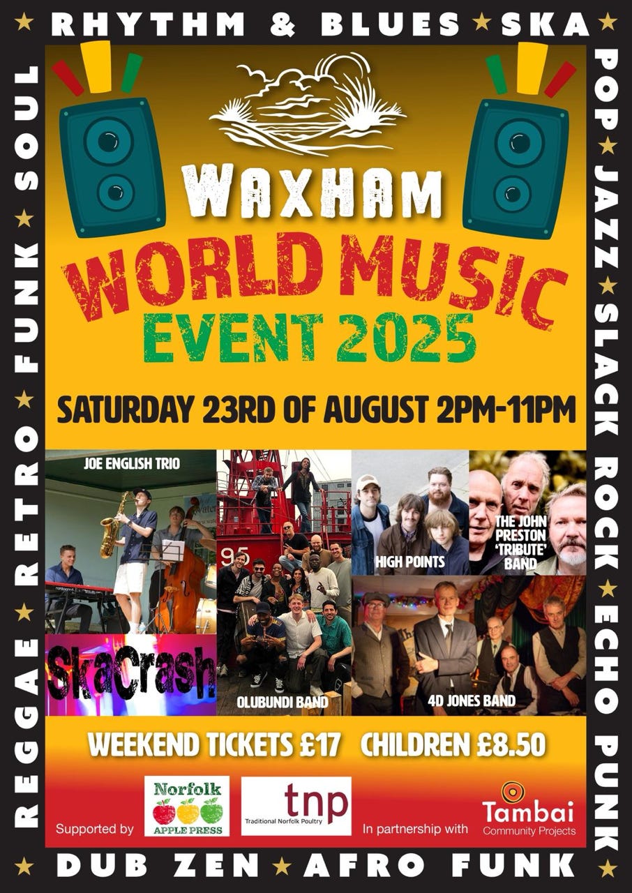 August bank holiday we go on a road trip. Saturday 23rd we play just off the beach at Waxham a funky event organised by singer Anna Mudeka. We’ve secured a few “genre” checks on the poster for the audiences confusion. Dub Zen and Slack Rock and maybe the punk thing too. If you haven’t heard us yet, we’re in that ball park, sort of! Sorry I cannot find a link. Hopefully there will be time for a swim after our set, then off to Battle in Sussex to Play the Hope Freedom Festival. A community project that has been roundly smeared by the likes of the Daily mail, what more of an endorsement could you wish for?